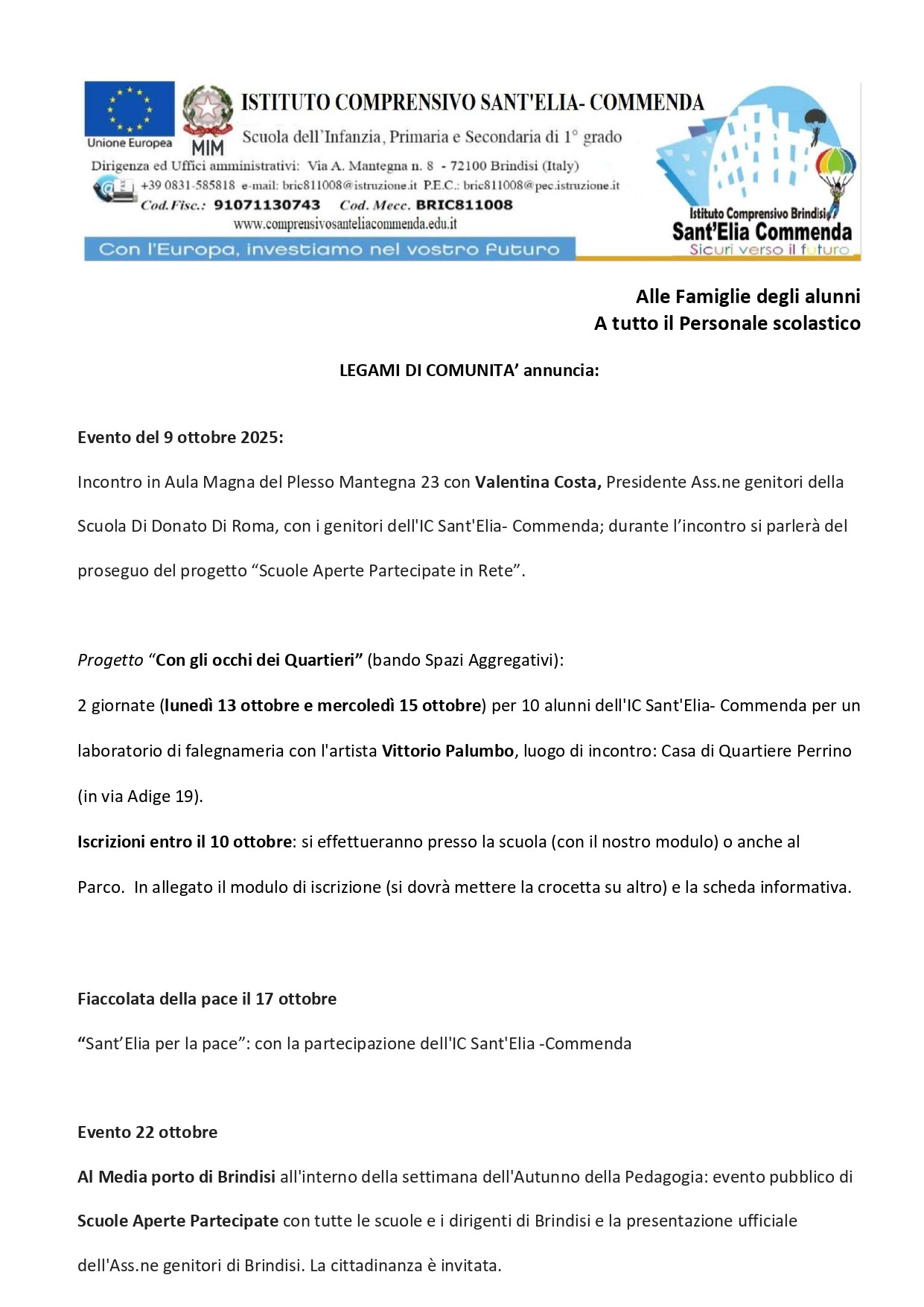 HomeSlide news In primo pianoEVENTI “LEGAMI DI COMUNITA’” EVENTI “LEGAMI DI COMUNITA’” Categorie In primo piano Slide news Data: 07/10/2025 PARCO IN FESTA 2025 – FESTA DELLO SPORT, ARTE E CULTURA – Sabato 4 ottobre 2025 CIRCOLARE ELEZIONI RAPPRESENTANTI GENITORI A.S. 2025-2026